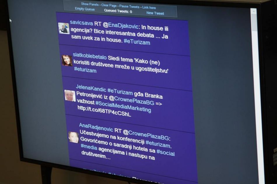 Prvu eTurizam konferenciju otvorili su gospodin Žarko Malinović ispred Privredne komore Srbije, Petar Slavković ispred udruženja Srbija za mlade i Milan Stojković u ime agencije TMC, a učesnicima se obratio i gospodin Miodrag Popović, v.d. direktor Turističke organizacije Beograda. Sama konferencija sastojala se od blokova predavanja i panel diskusija.
